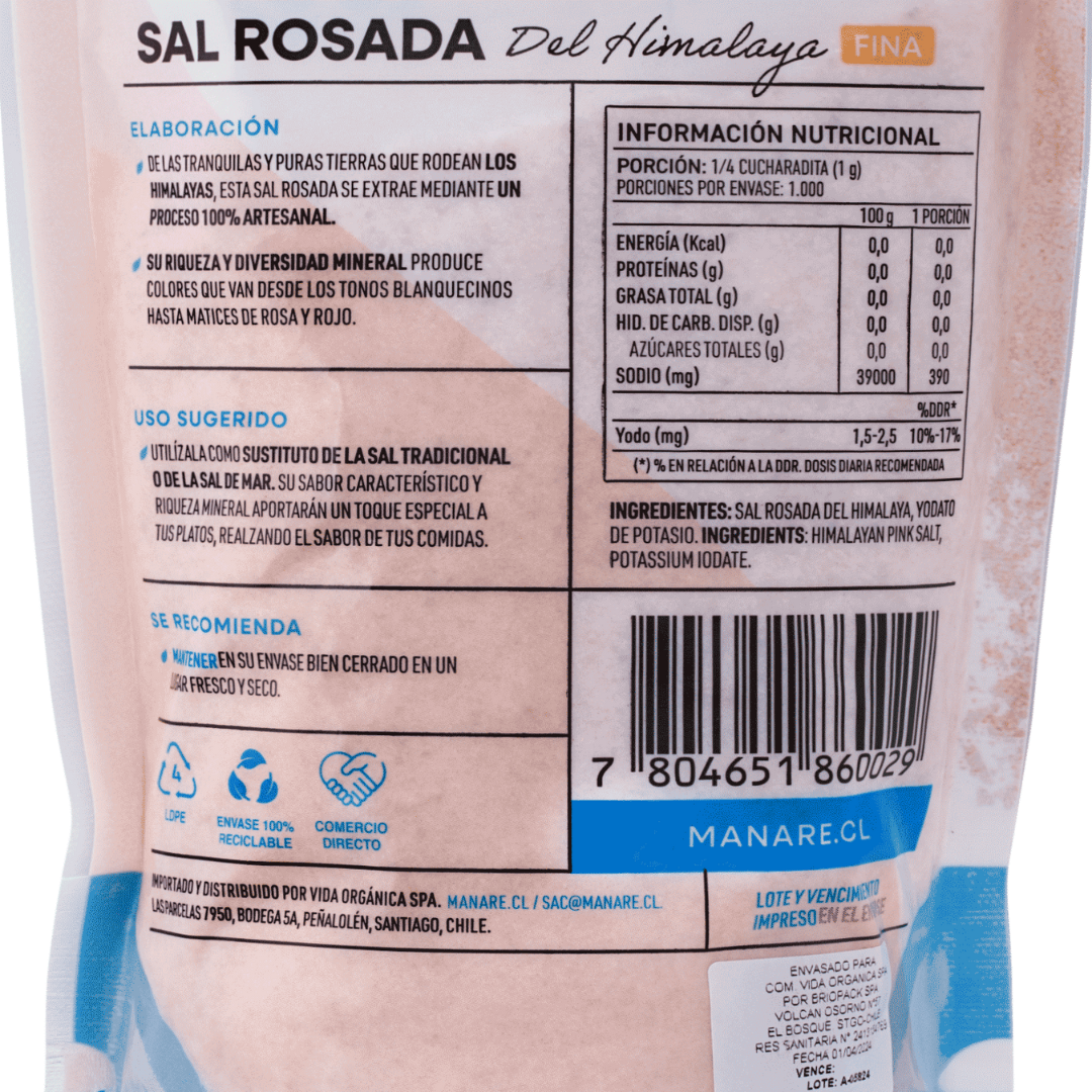 Ingredientes: 100% sal rosada del Himalaya y yodato de potasio.