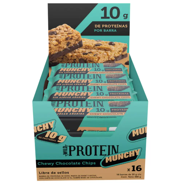 La Wild Protein Munchy Chocolate Chips es una versión más ligera y económica de la línea de proteínas, diseñada con una textura masticable (chewy) y enfocada en ser un postre saludable.